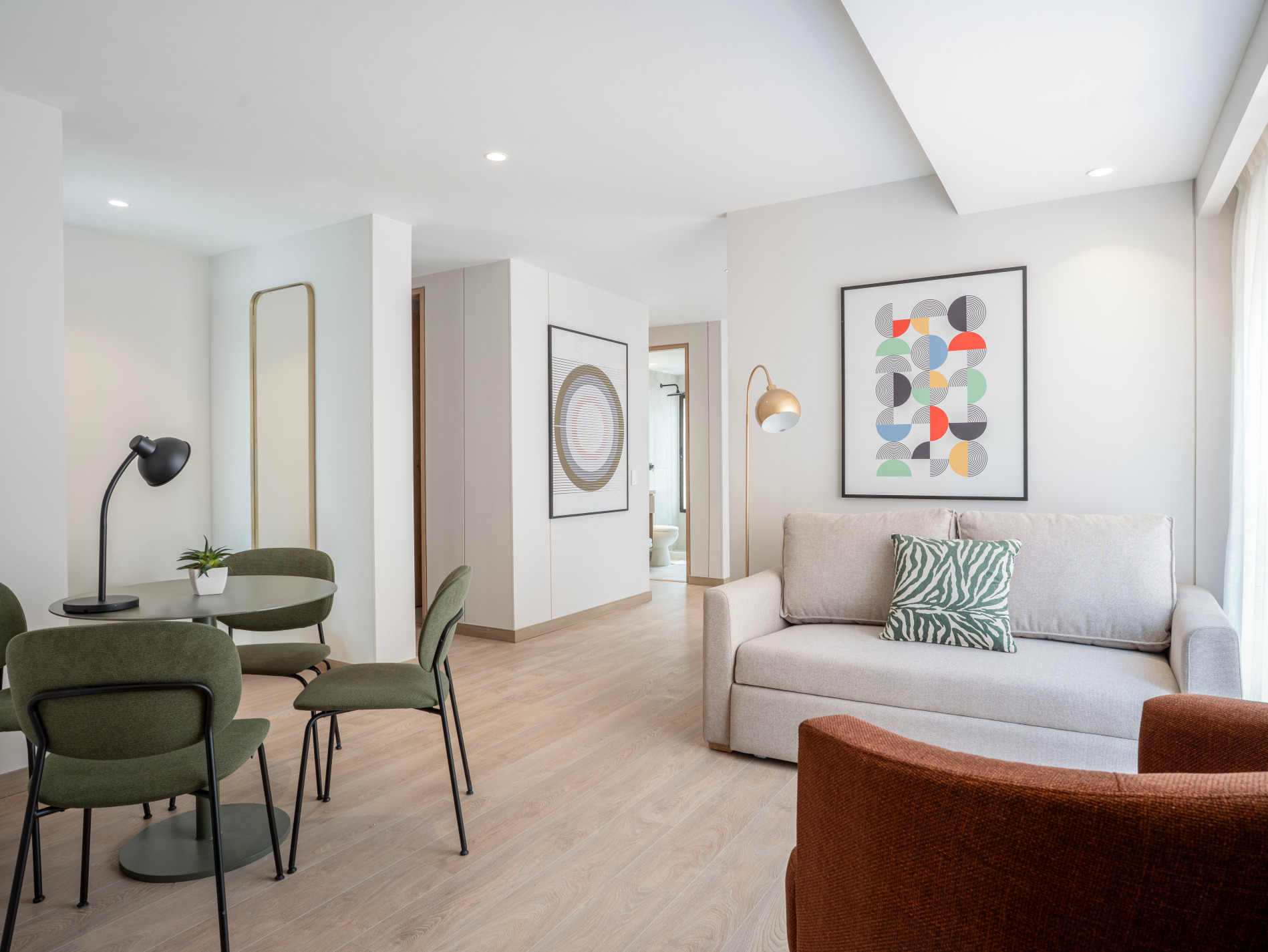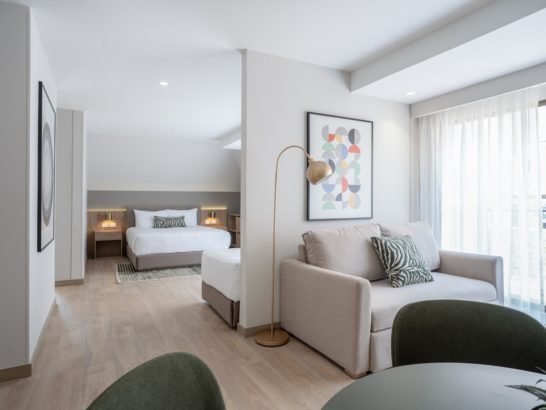 Apartamento de lujo de 61 m2 diseñado para los viajeros que buscan la mayor cantidad de espacio y flexibilidad. Apartamento con cama queen, una segunda cama sencilla y sofá cama. Dos baños, cocina equipada y dos balcones. Ideal para medianas y largas estadías o grupos grandes. Caja fuerte, internet de alta velocidad y smart TV de 50”.