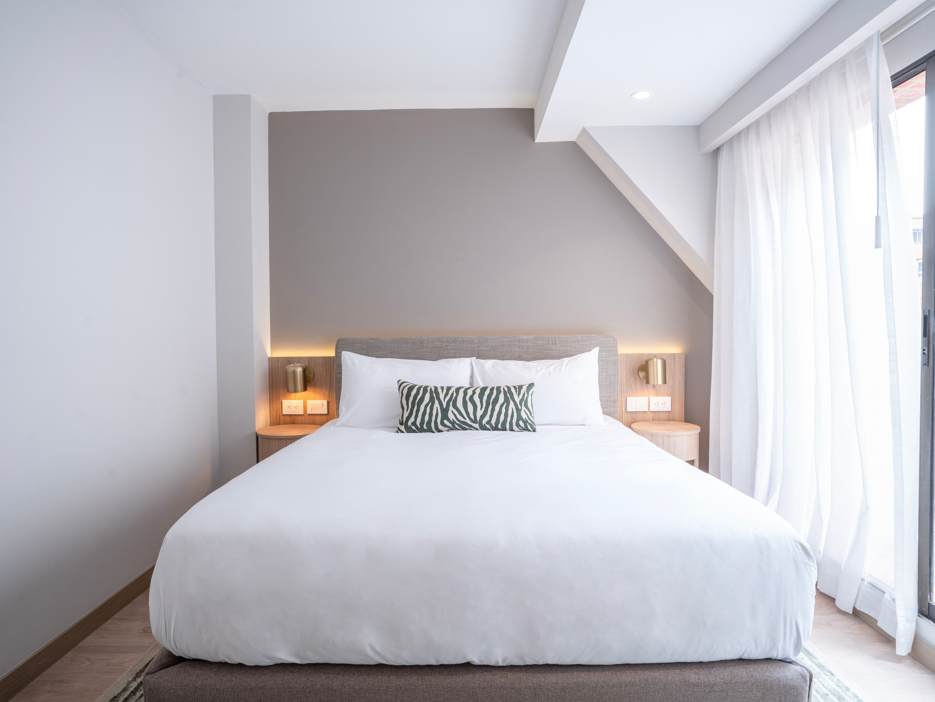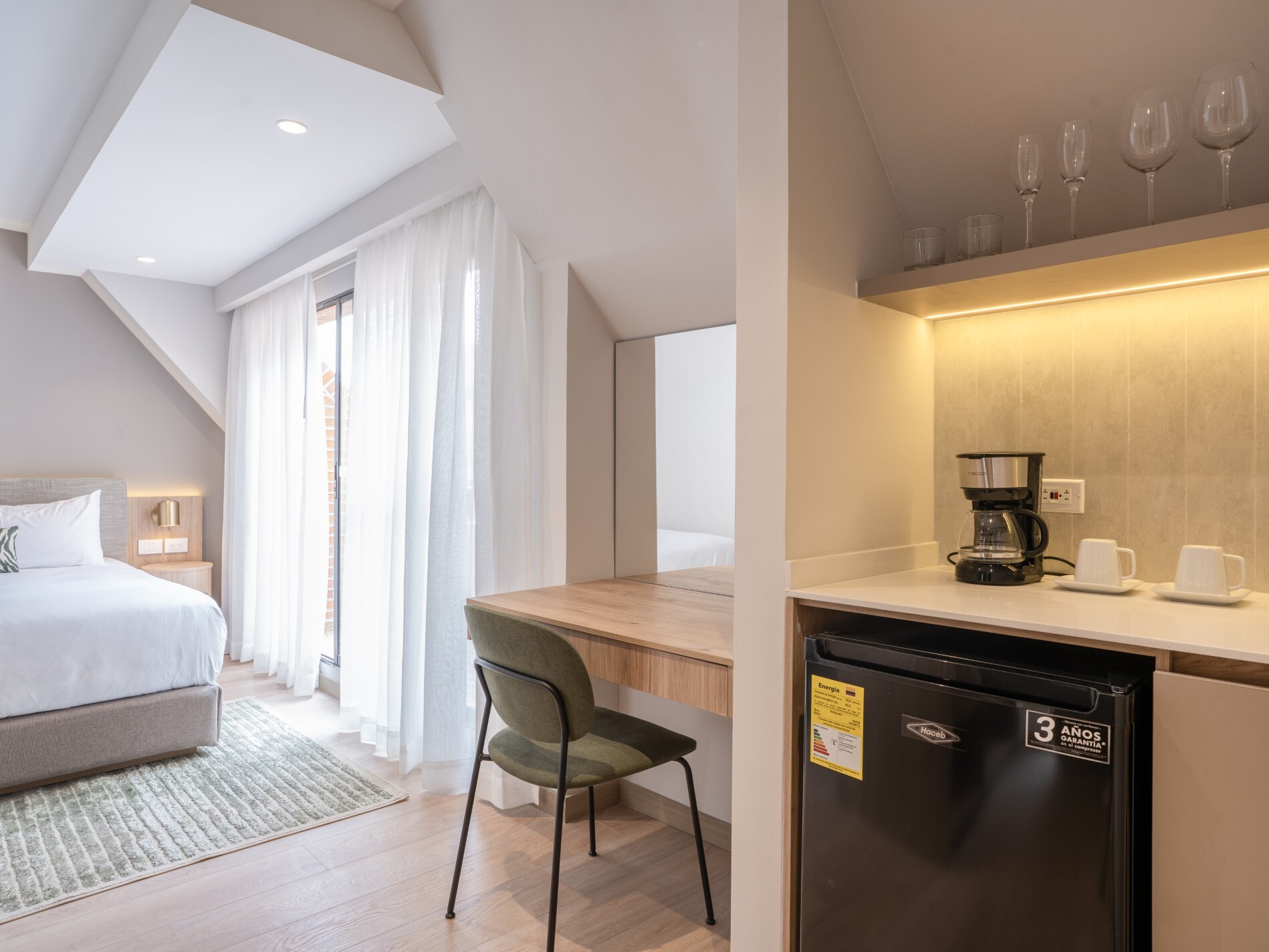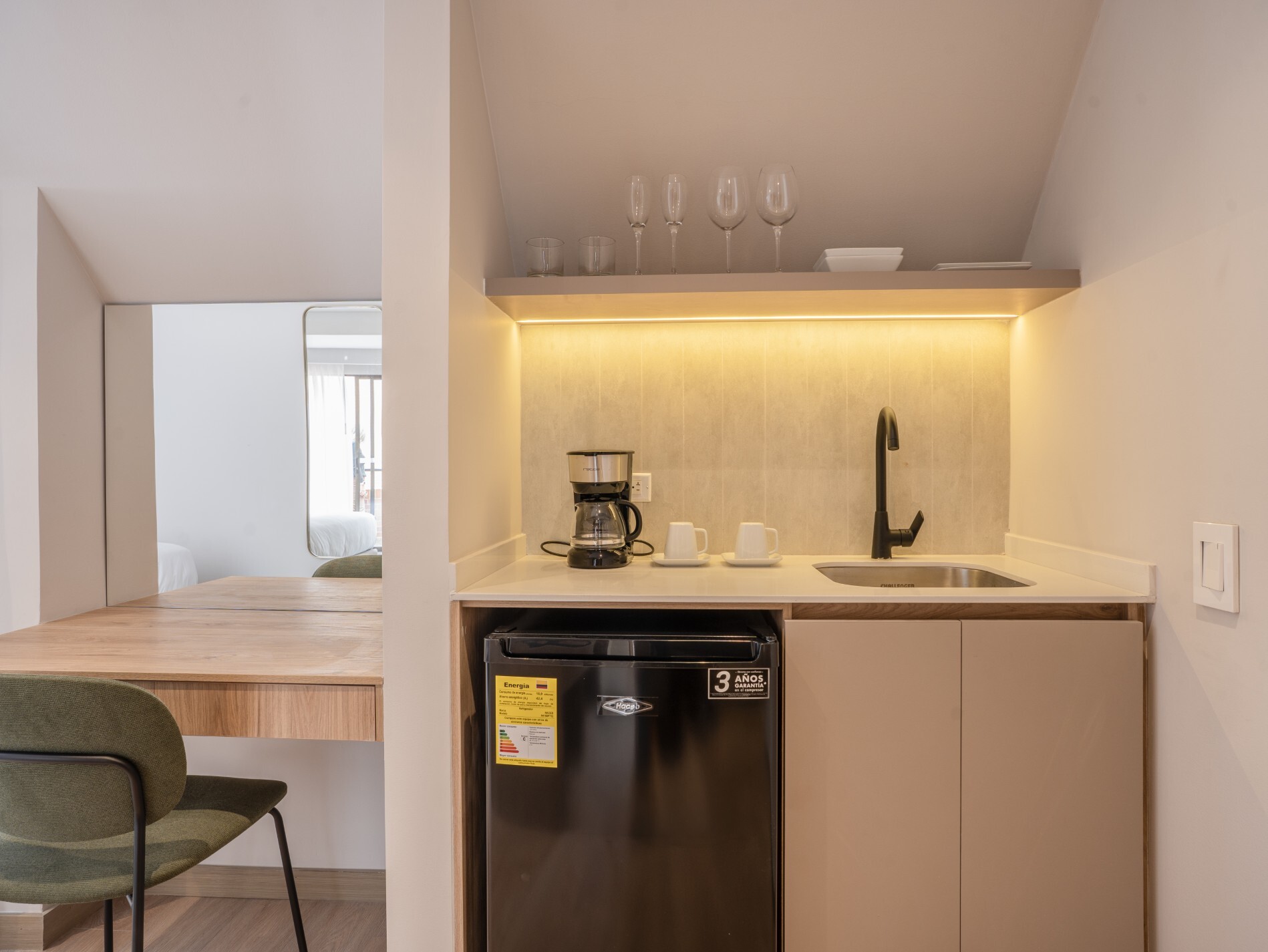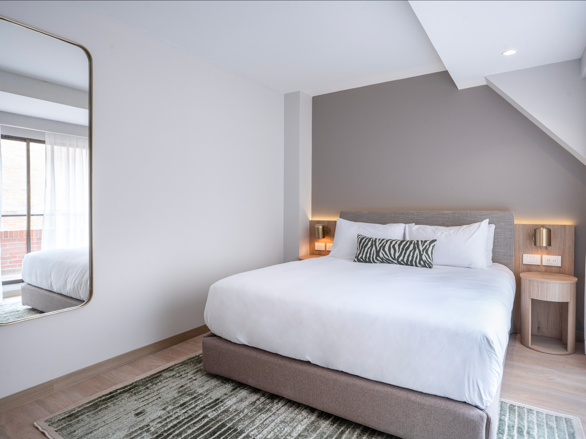Estudio amoblado de 29 m2, diseñado para estancias cortas y rápidas en la ciudad. Con cama queen, nevera, cafetera y menaje. Baño con amenities, caja fuerte, internet de alta velocidad, smart TV de 50”.