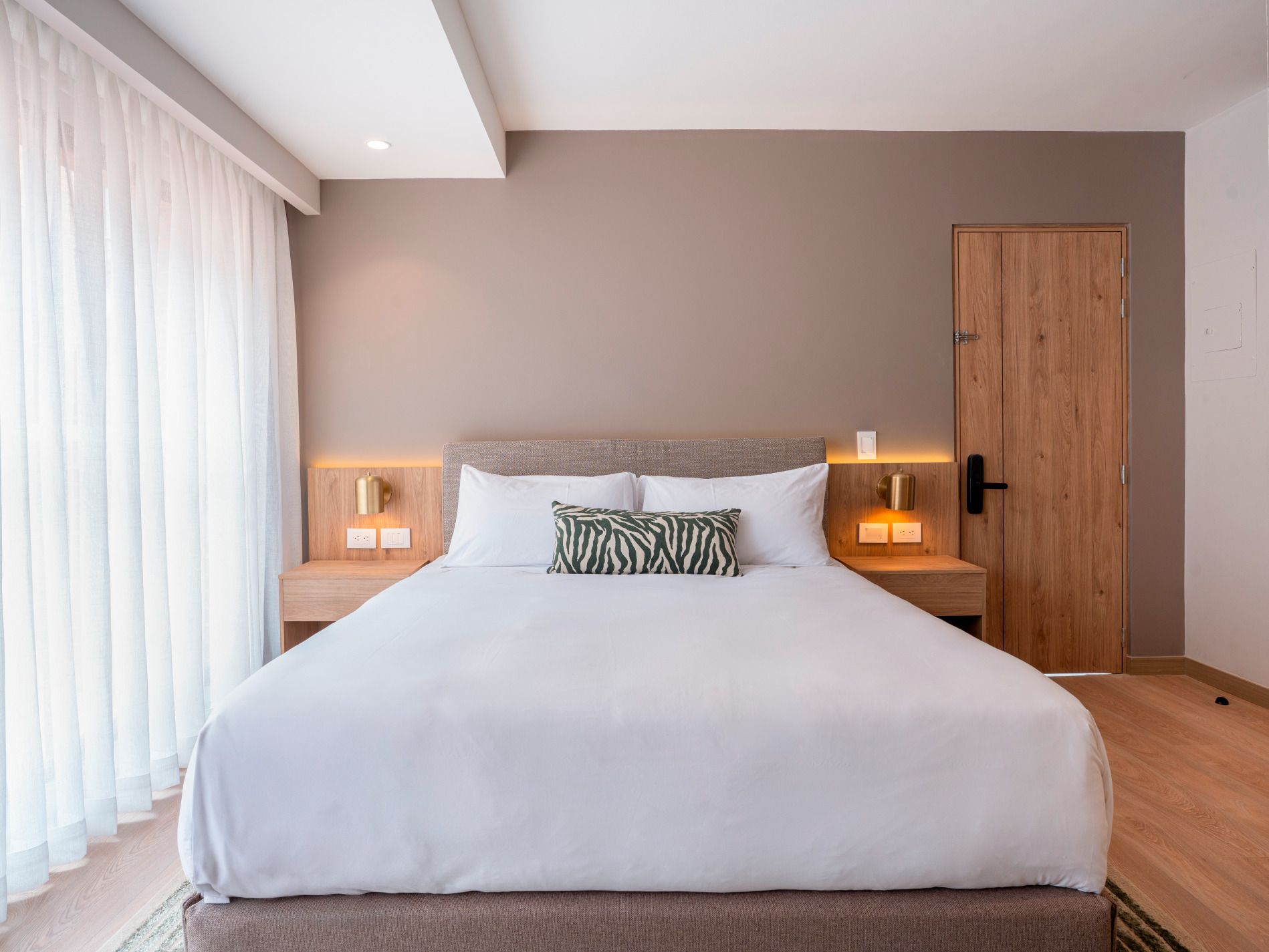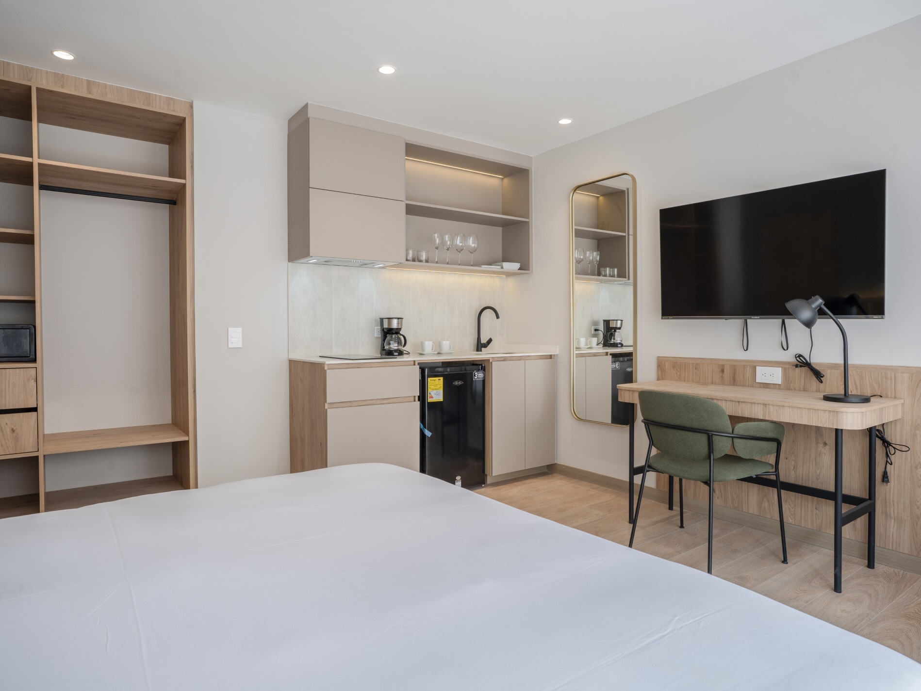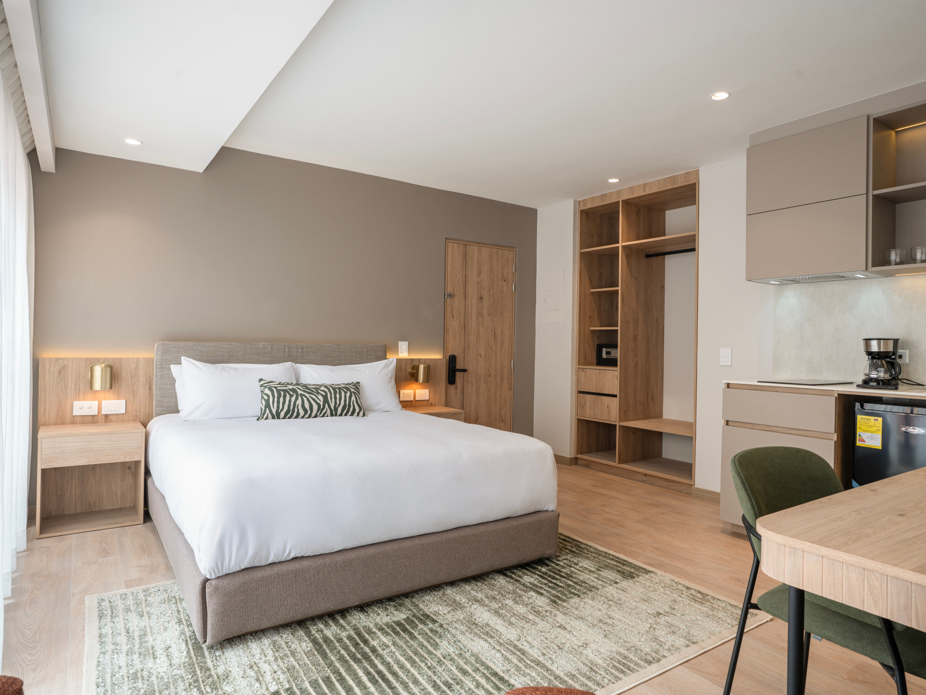 Estudio de 30 m2, diseñado para la versatilidad y eficiencia. Cama queen, sofá cama, comedor y cocina equipada. Caja fuerte, internet de alta velocidad y smart TV de 50”.